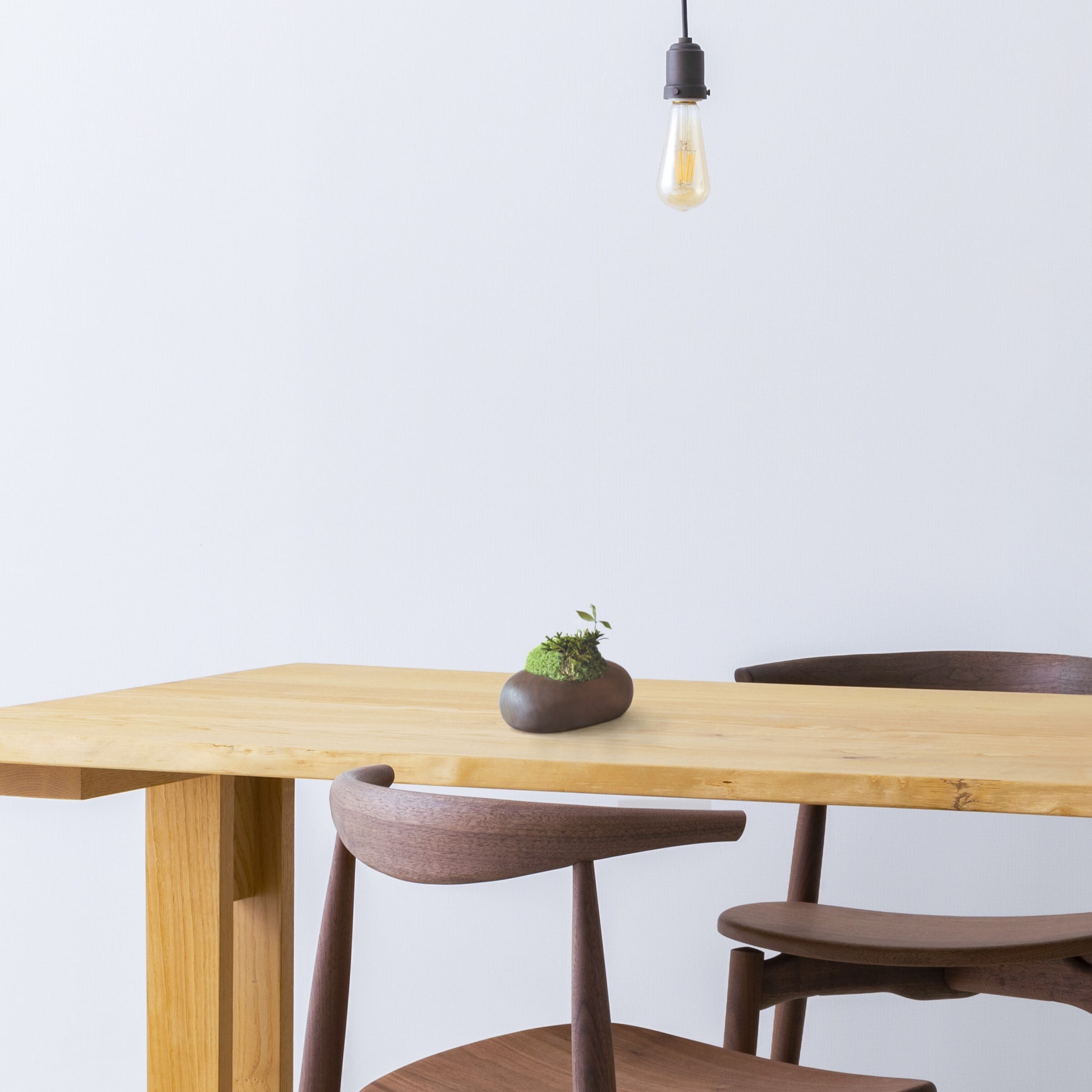 両手の平に、ころんと納まる丸みのある台座は、一枚板の天板を加工する際に残った部分を活用しています。
