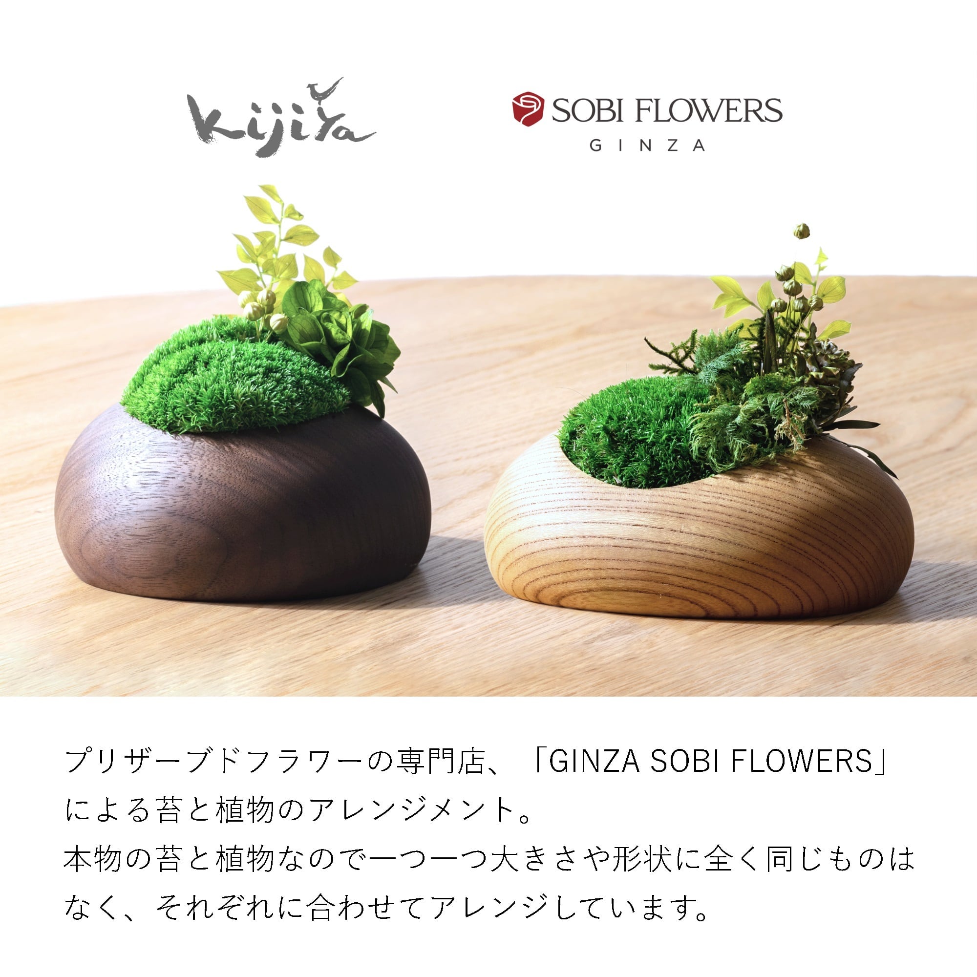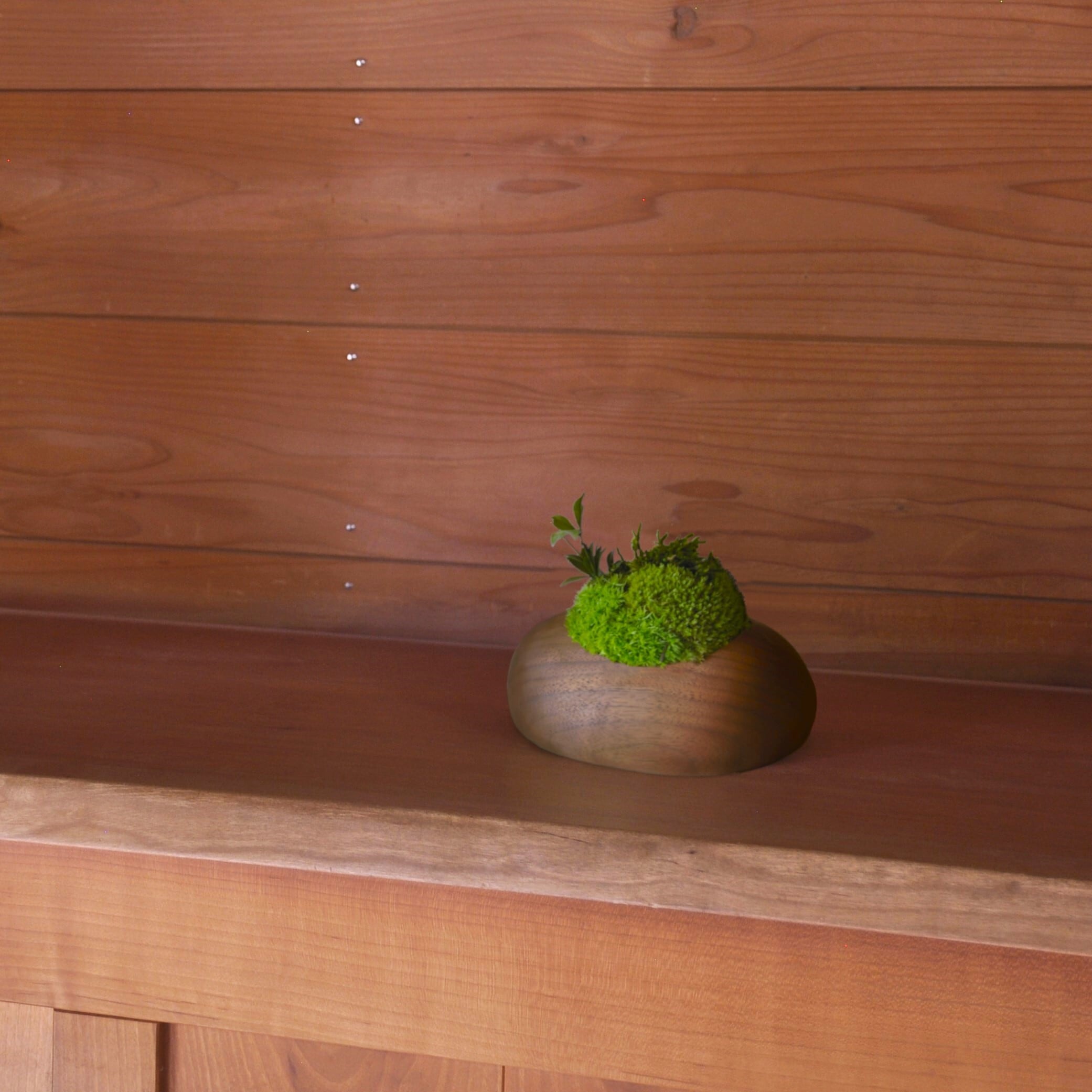 無垢の木の台座に、長期保存加工された苔と植物をあしらった、癒しのインテリア。