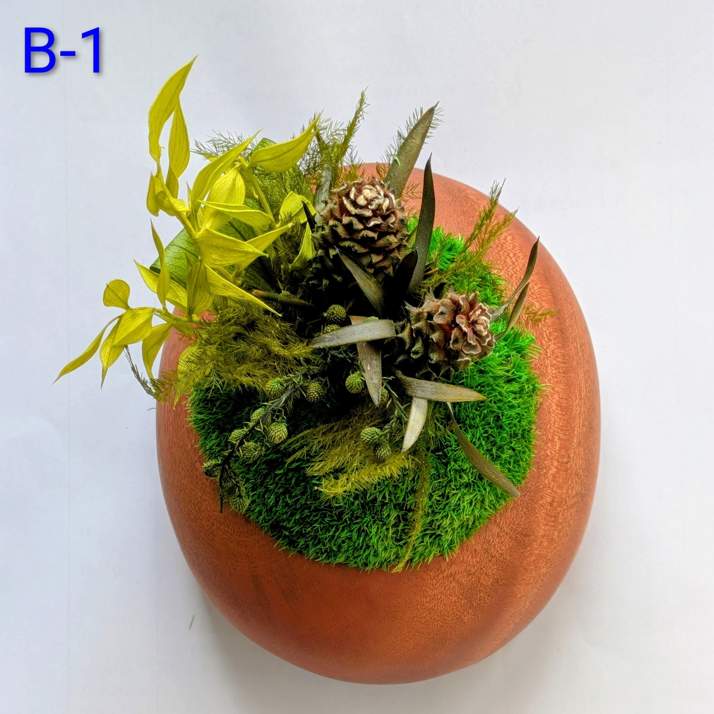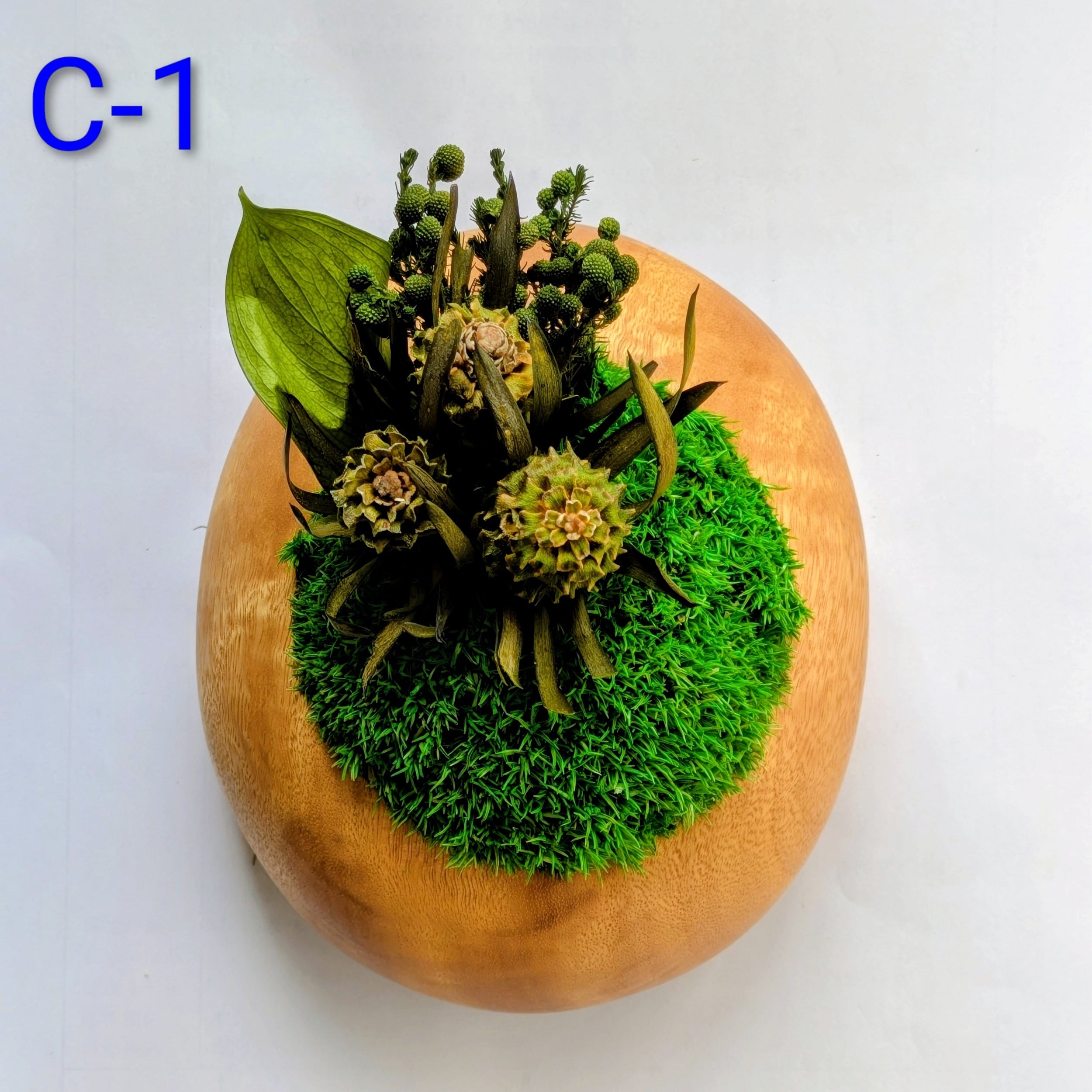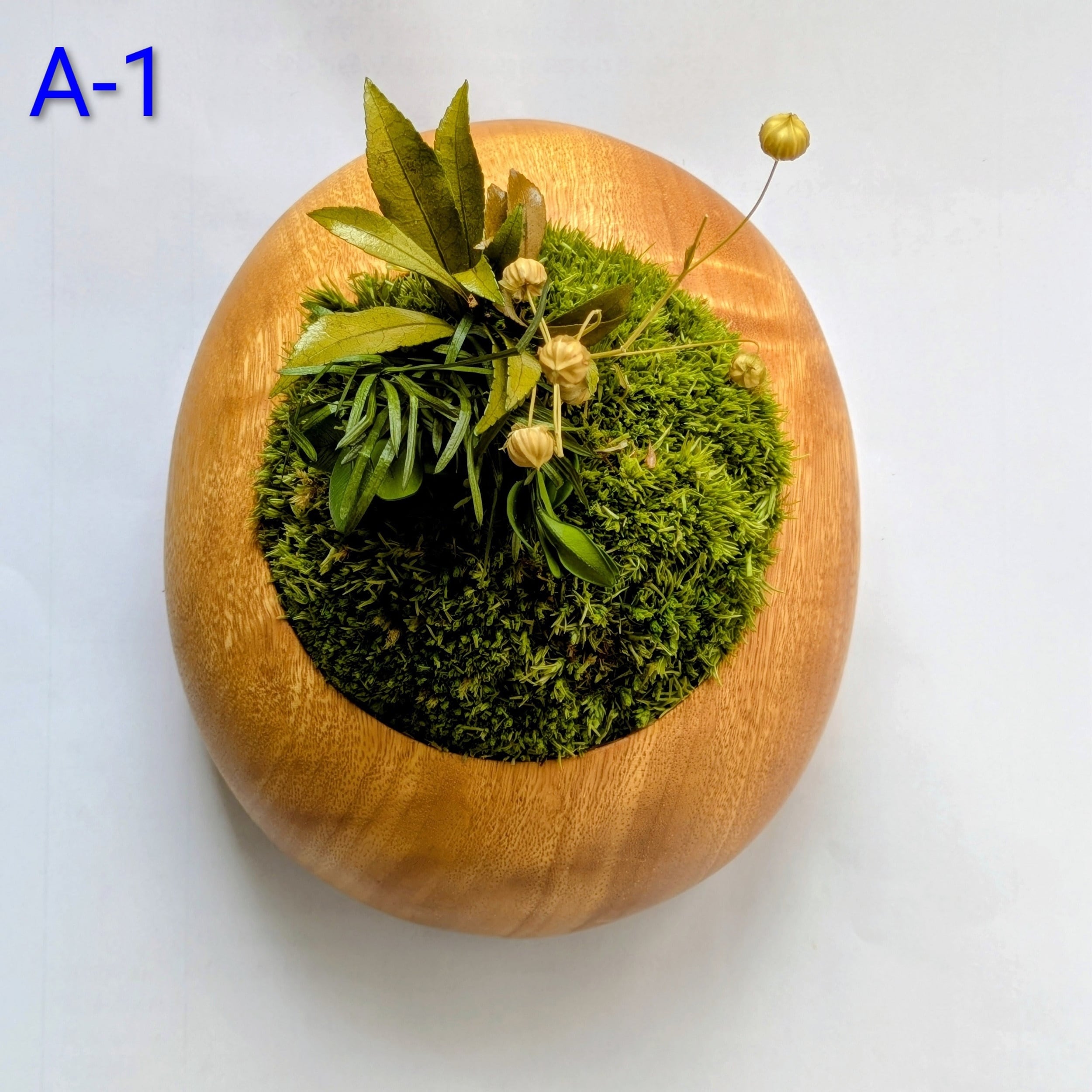 無垢の木の台座に、長期保存加工された苔と植物をあしらった、癒しのインテリア。