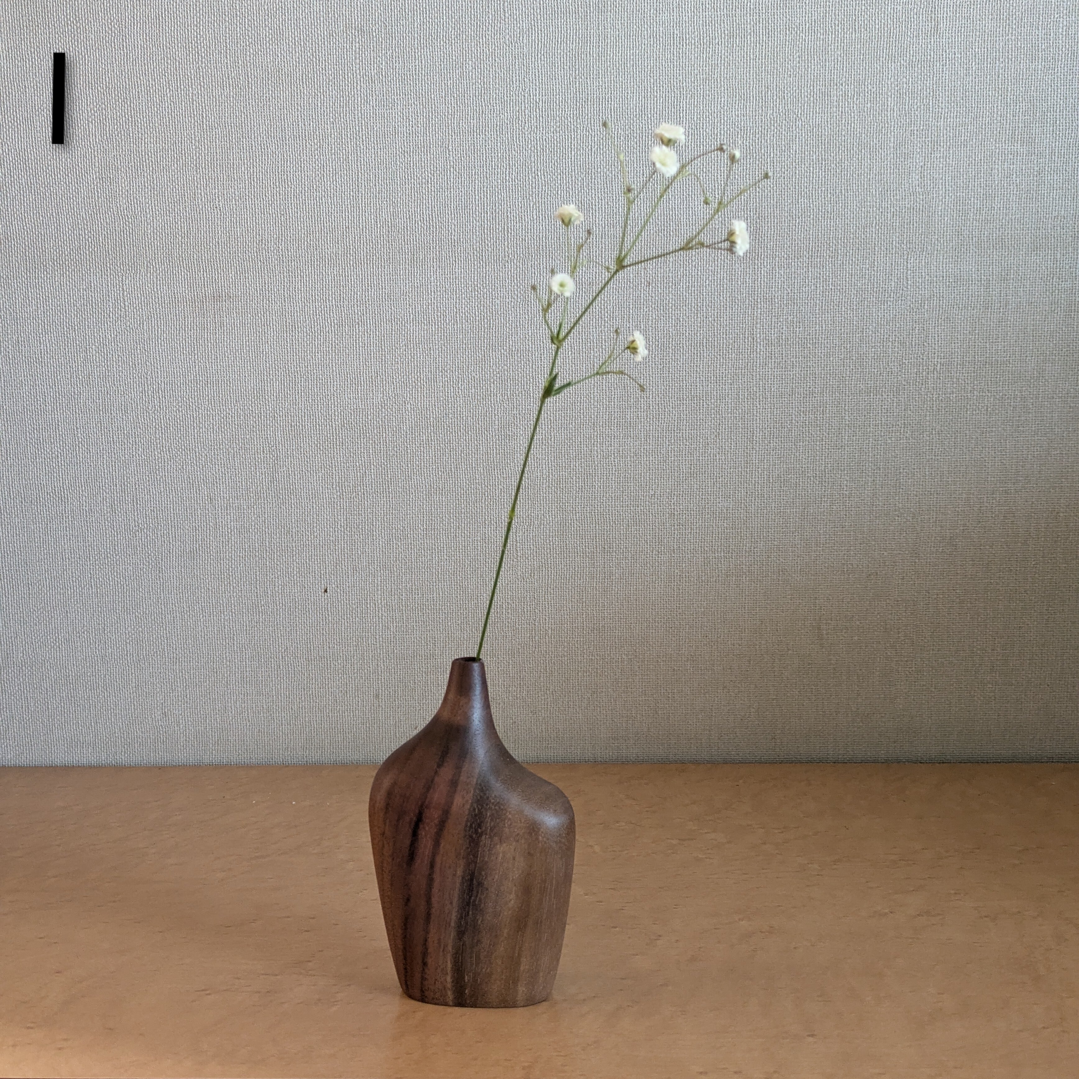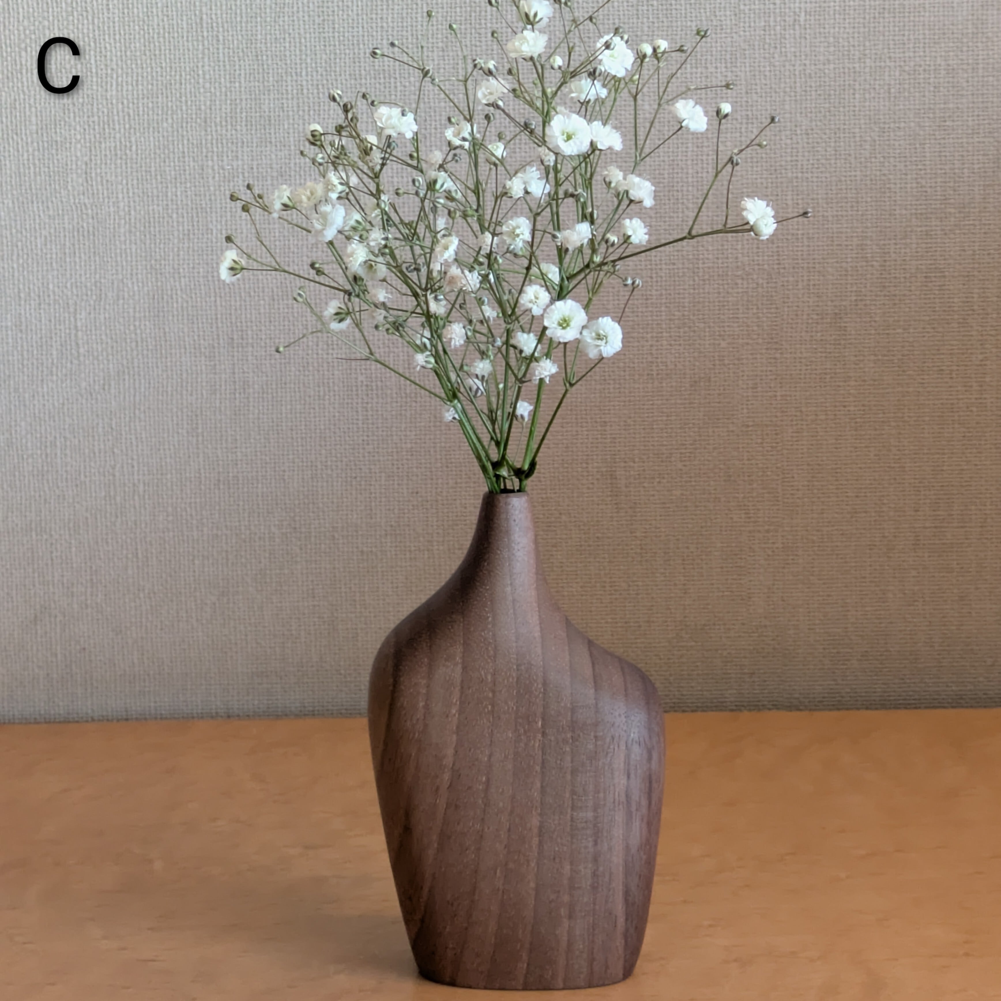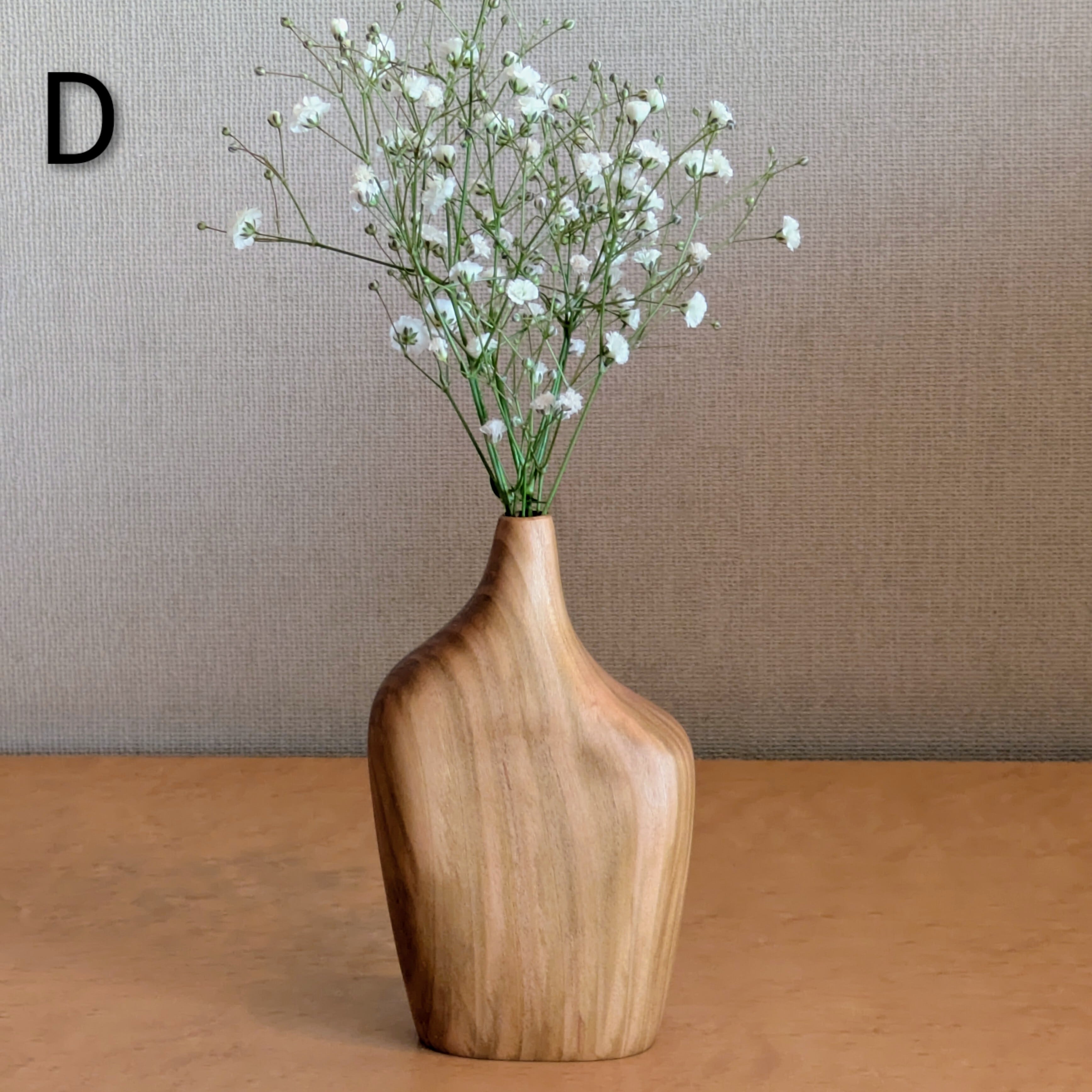 両手に収まるアシンメトリーな形をした、無垢の木を削って作られた一輪挿し。